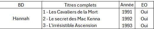 Bande dessinée Hannah, série complète des 3 numéros (voir la photo pour le détail).