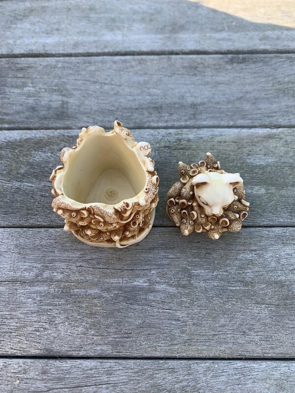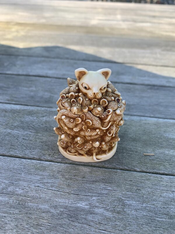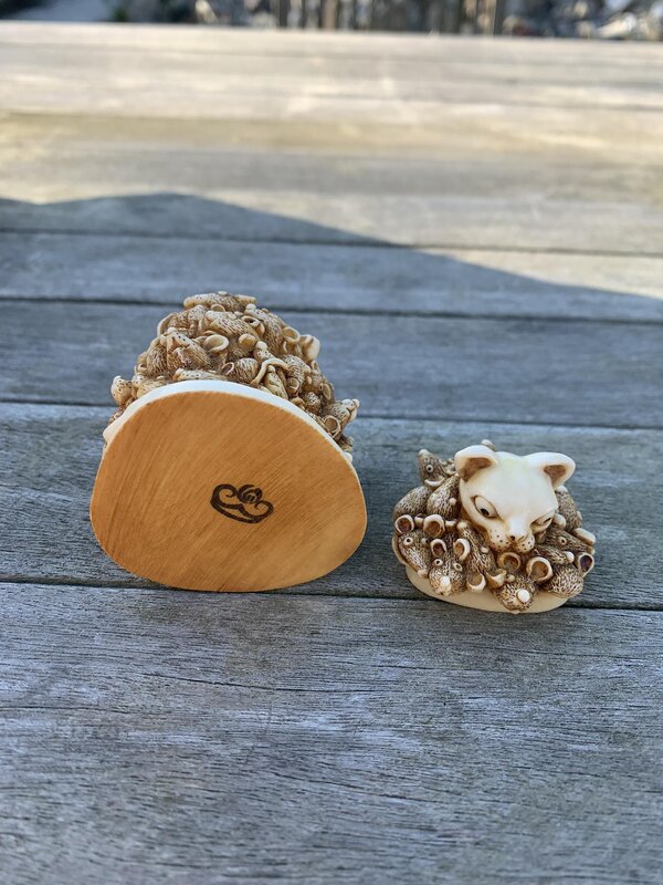 Boîte de la collection Harmony Kingdom Collection modèle : le chat et les souris. Ce modèle est intitulé "Too Much of a Good Thing". Il s'agit de la catégorie des boîtes à trésors pour y cacher la 1ère dent de lait ou la 1ère mèche de cheveux.