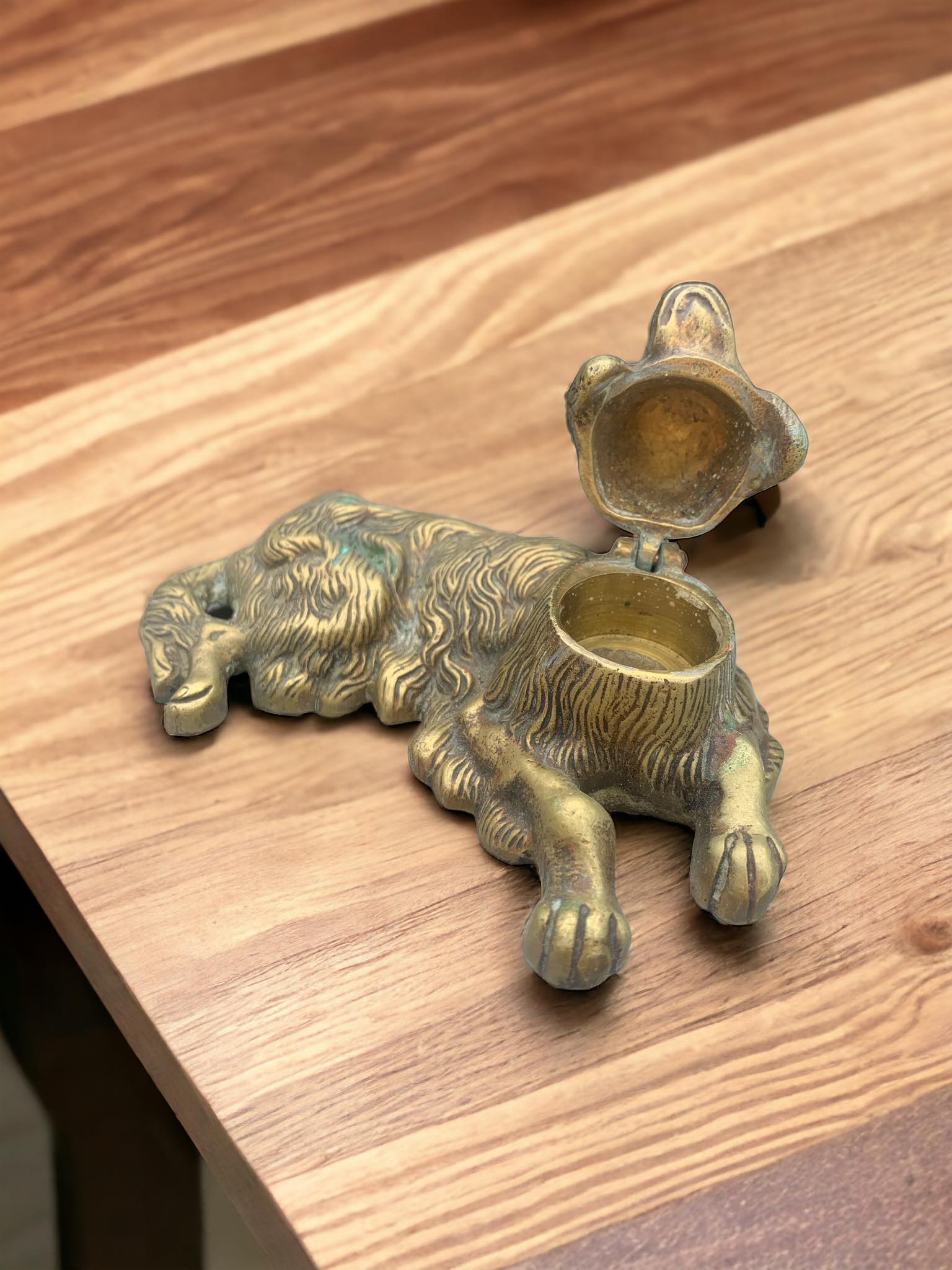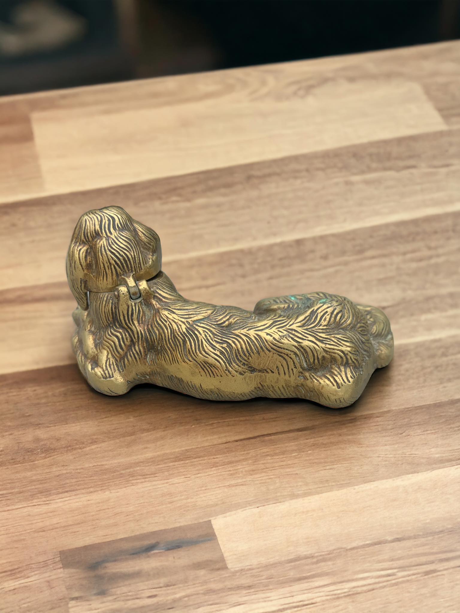 Sculpture en bronze doré d'un chien dont la tête se redresse pour laisser place à un encrier