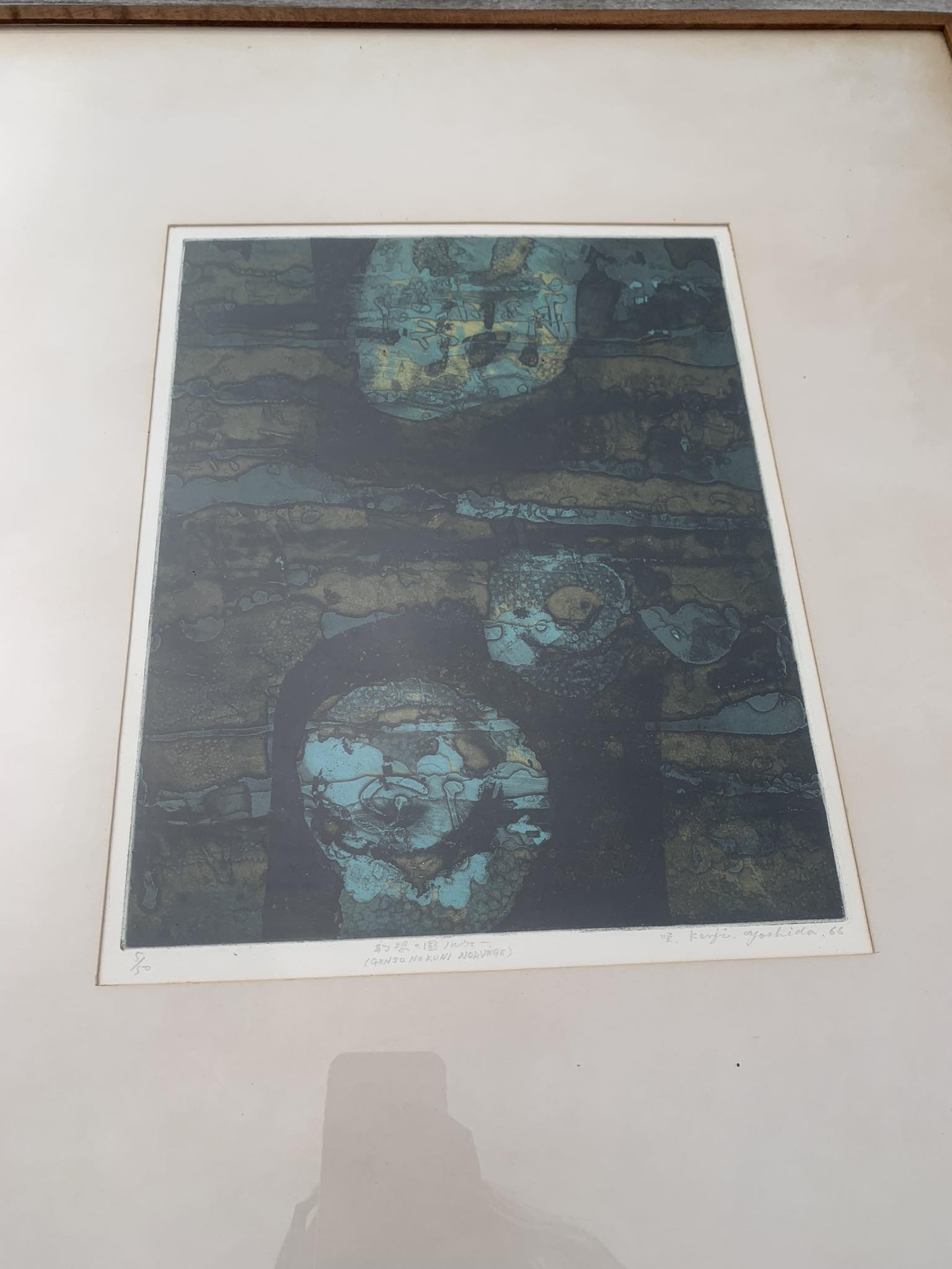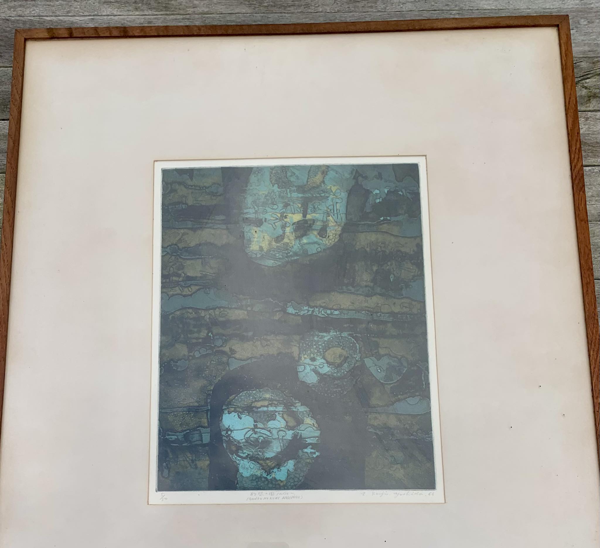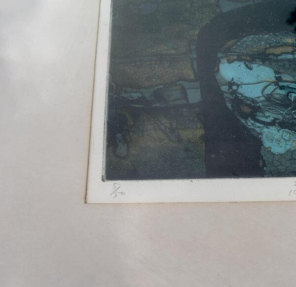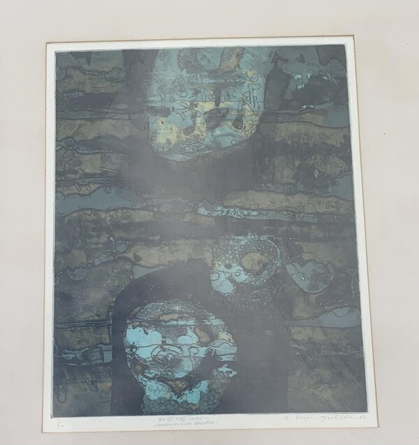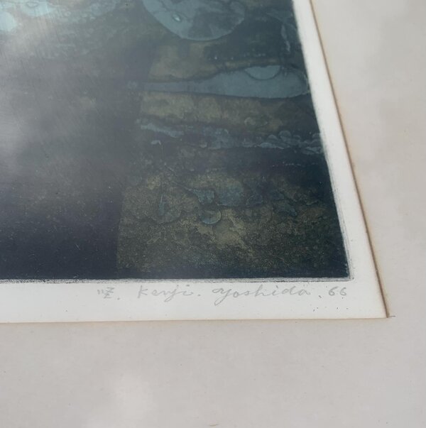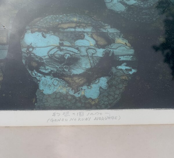 Estampe eau-forte couleur de l'artiste Yoshida Kenji (1924 - 2009). Elle est intitulée "Genso No Kuni Norvège" qui correspond à sa vision de la Norvège Pays des éléments. La signature de l'artiste apparait en bas à droite, l'œuvre a été faite en 1966 et est le tirage n°5 sur 50. L'estampe vous sera vendue dans son cadre en bois sous verre.