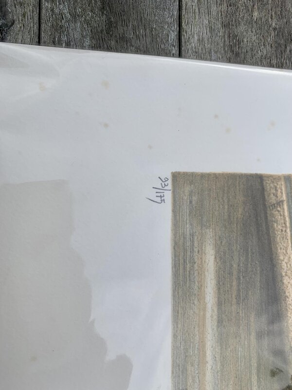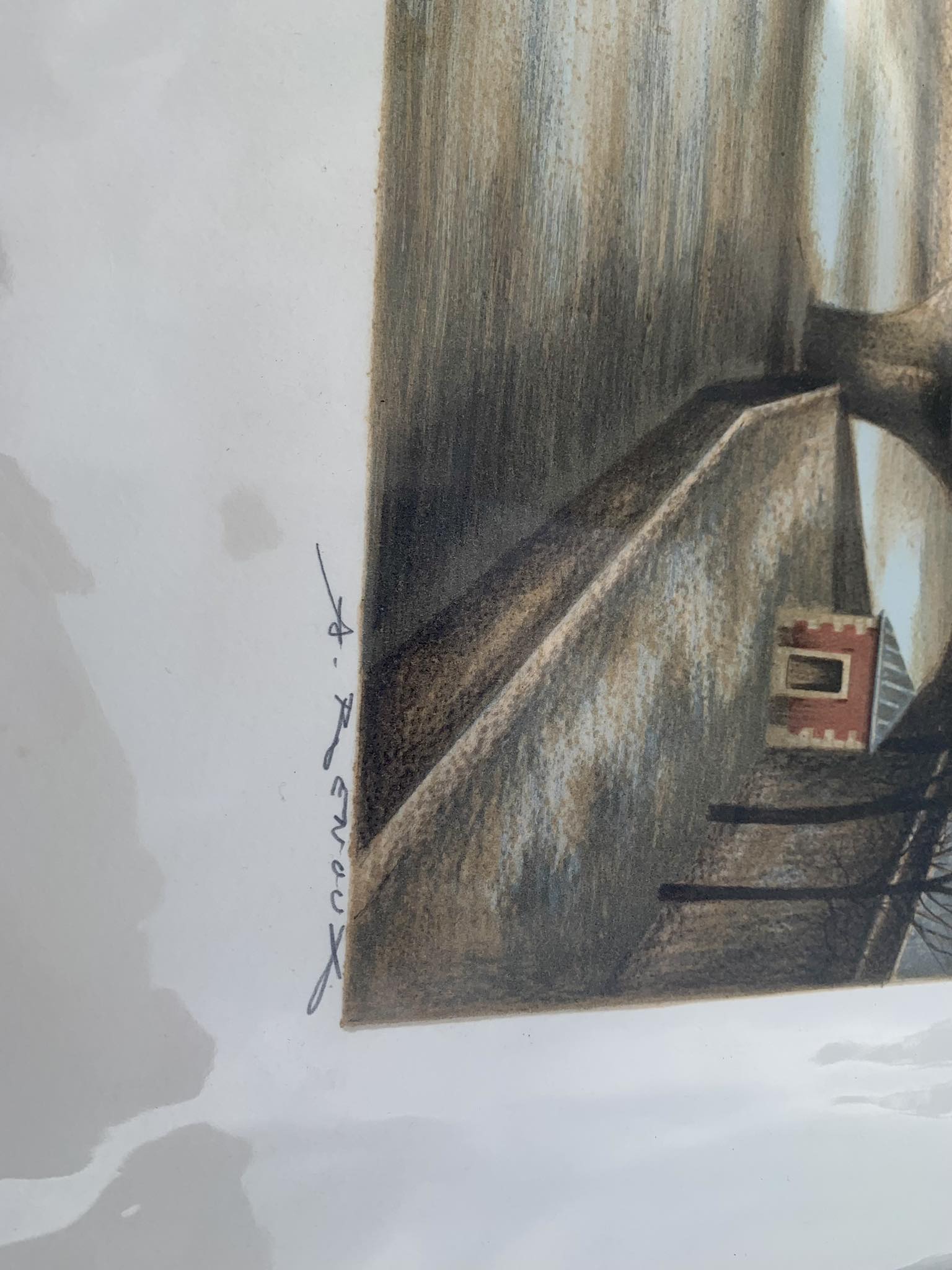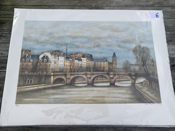 Estampe lithographie couleur de l'artiste français Renoux André (1939 - 2022). Elle est intitulée "Pont" et est le tirage n°93 sur 175. La signature de l'artiste apparaît en bas à droite et sera vendue sous un plexi pour la protéger.