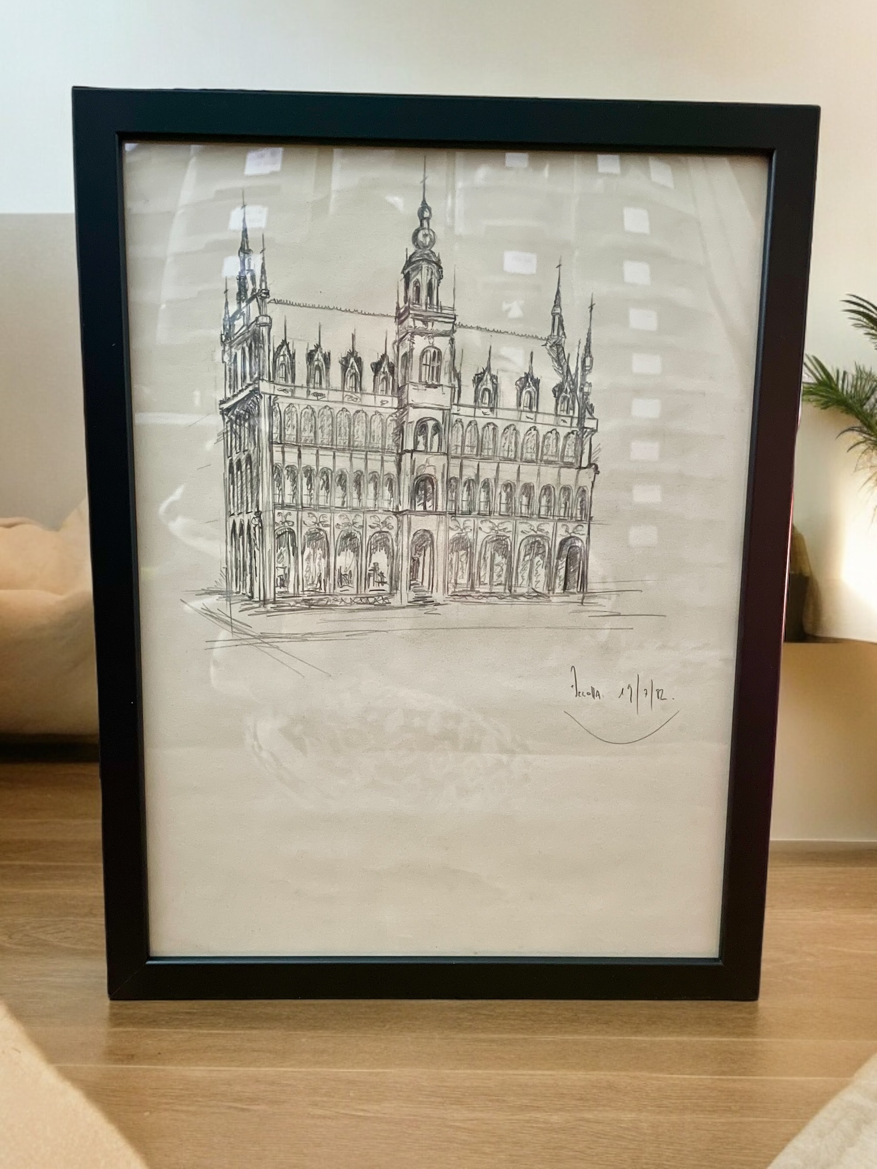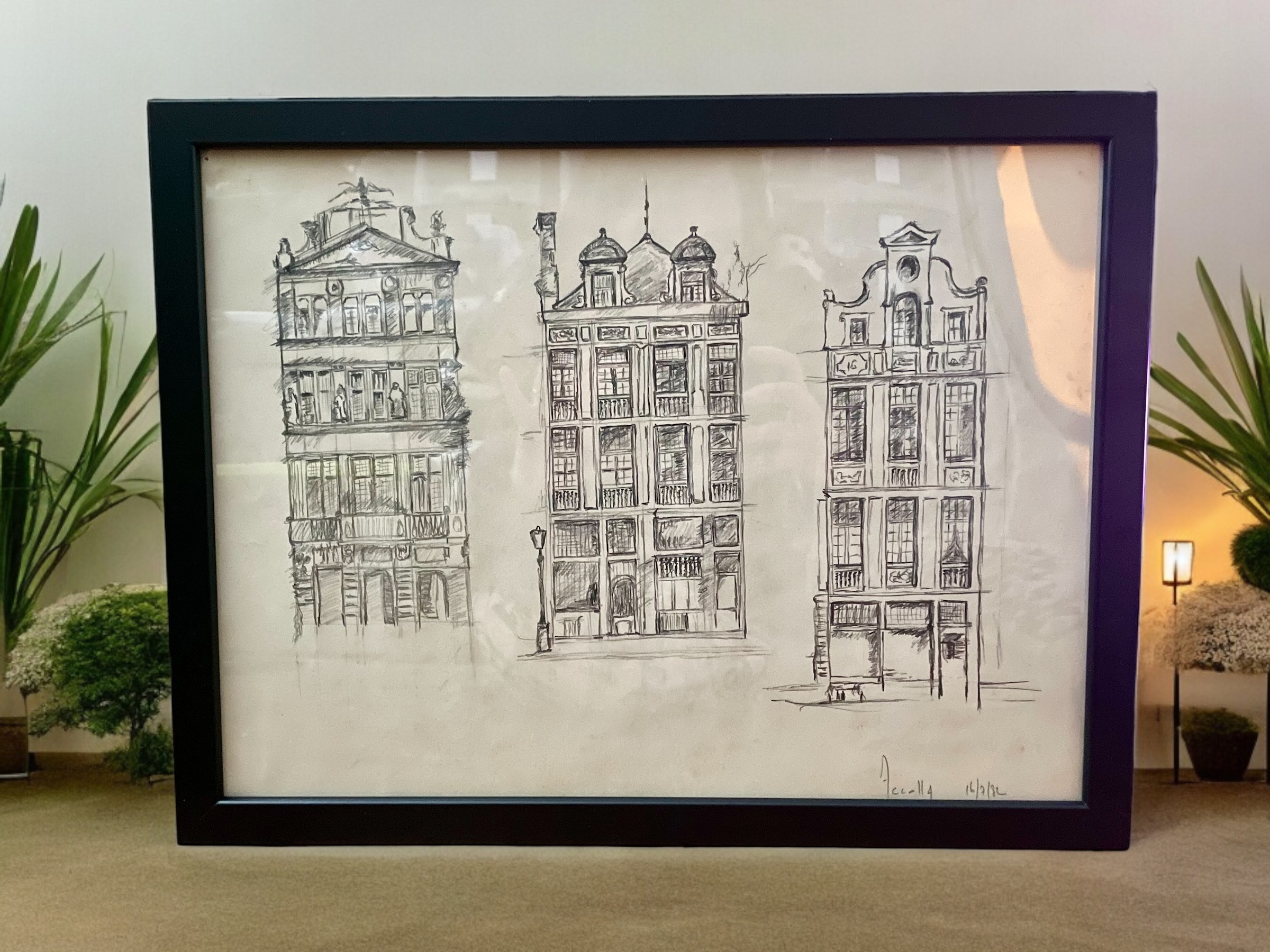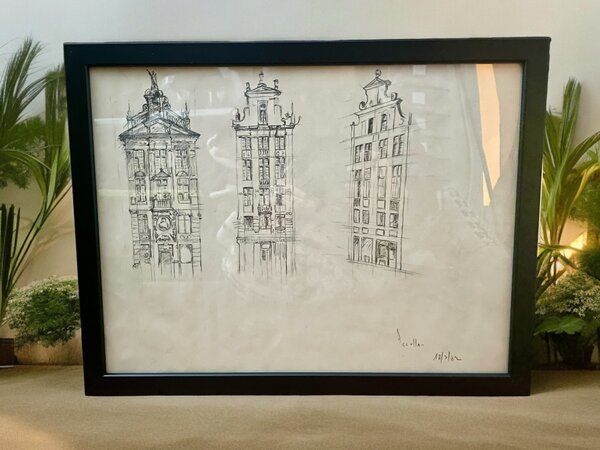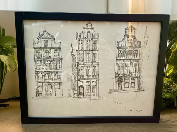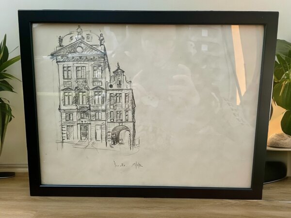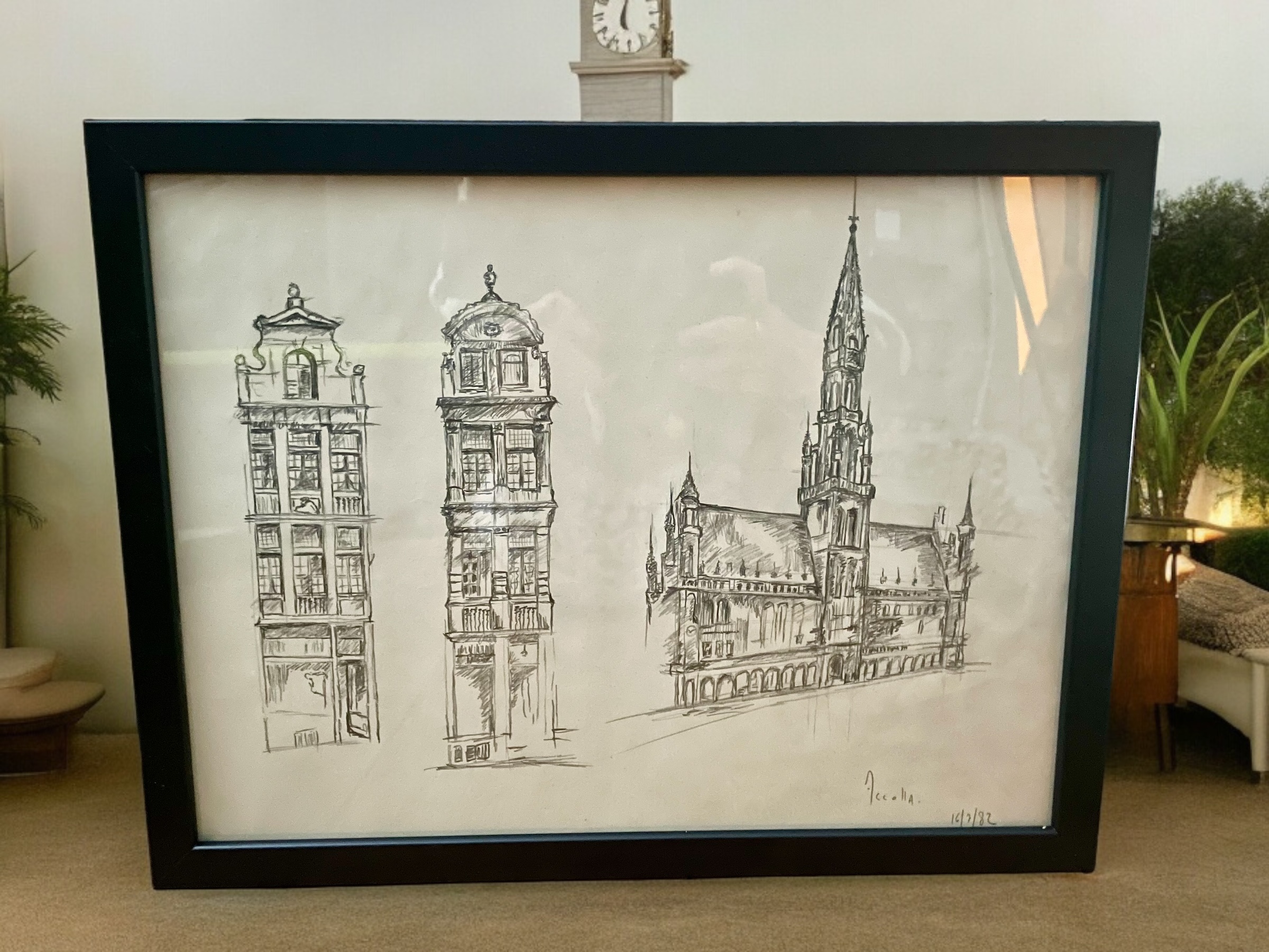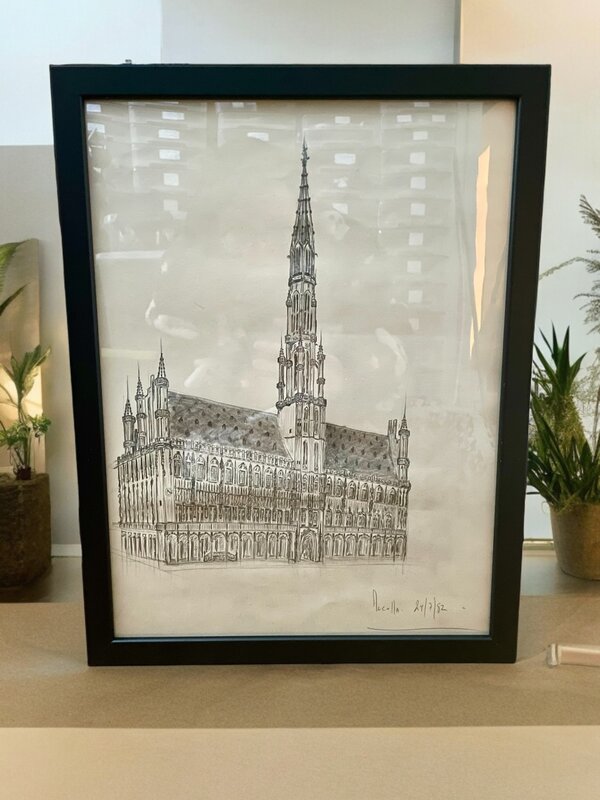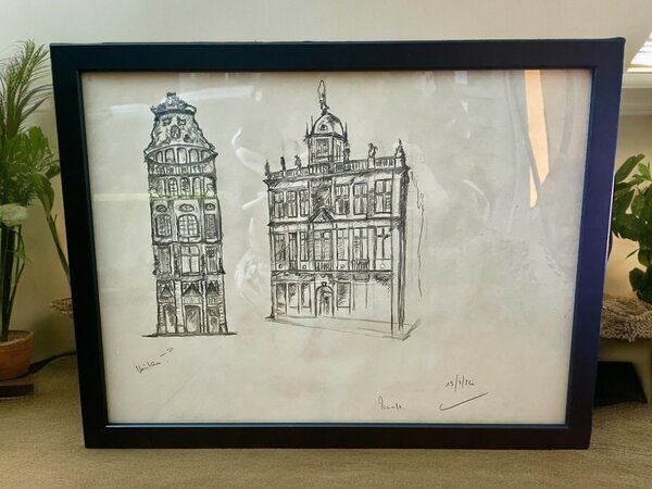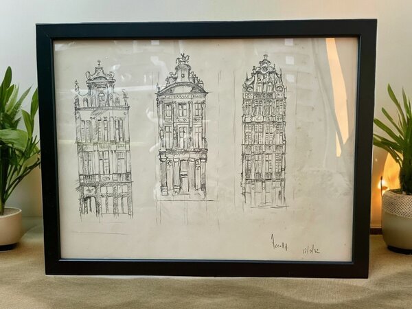Lot de 11 dessins représentant les bâtiments de la Grand-Place de Bruxelles. L'artiste a réalise les 11 dessins durant le mois de juillet 1982, la signature ne permet pas de l'identifier. Nous pouvons retrouver l'hôtel de ville, la maison du Roi, la maison des Ducs de Brabant et bien d'autres. Super chouette lot pour les amateurs de notre belle ville de Bruxelles !