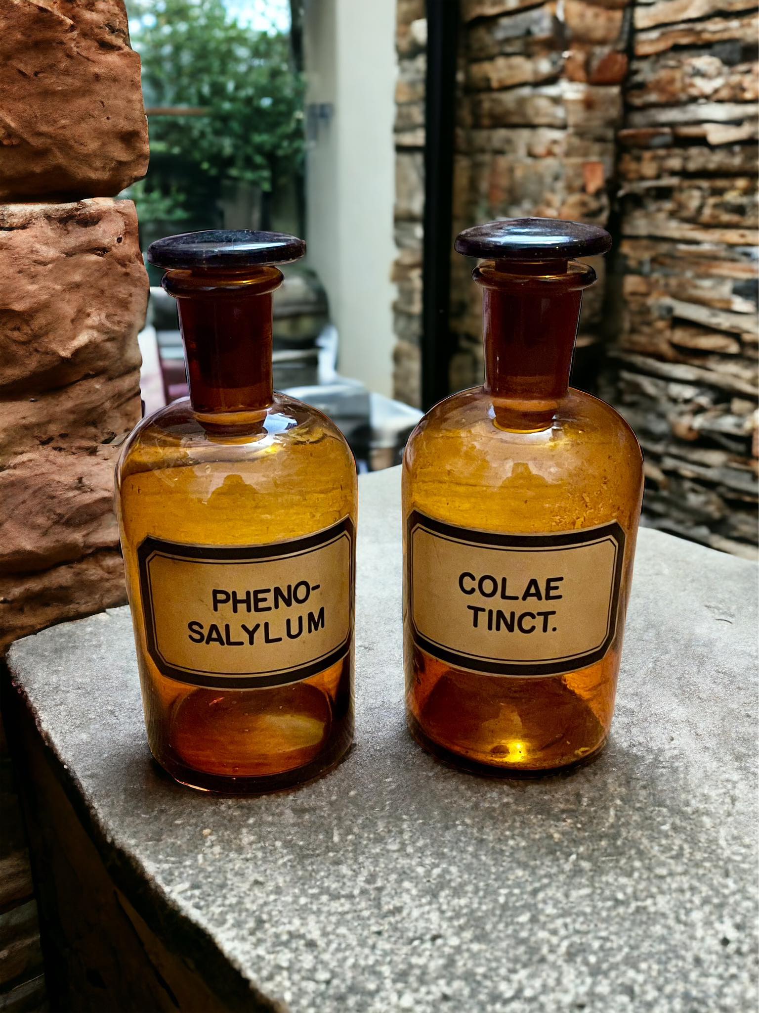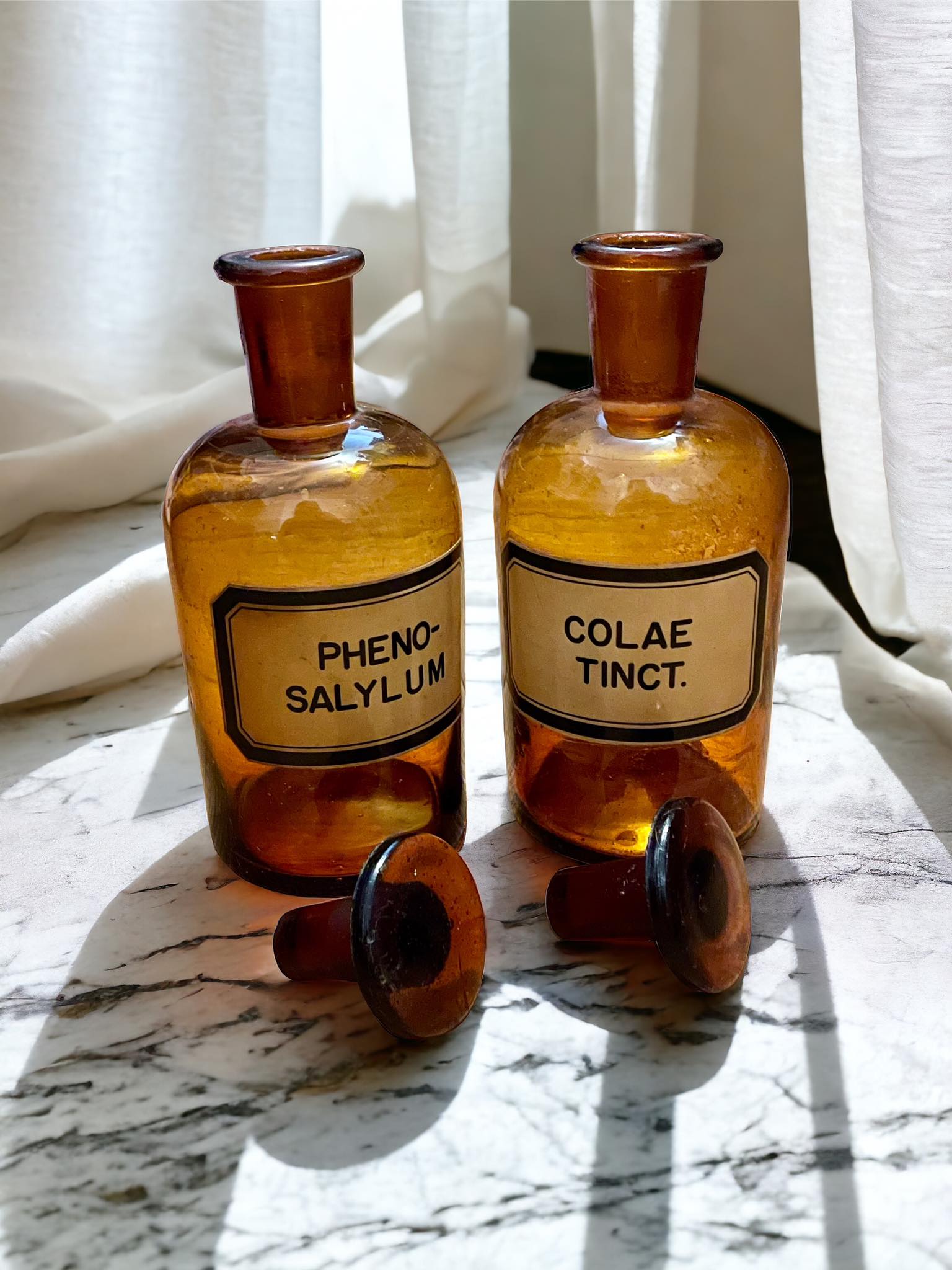 Lot de 2 pots d'apothicaire avec bouchon bombé, chaque pot peut contenir près de 60 cl et porte une étiquette : Phenosalylum & Colae Tinct