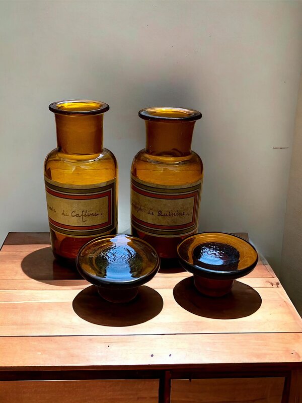 Lot de 2 pots d'apothicaires pouvant chacun contenir 17 cl. Chaque pot a son étiquette écrite à la main : Citrate de caféine & Brombydr. de Quinine