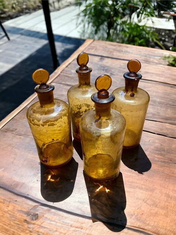 Lot de 4 flacons d'apothicaire en verre ambré plus clair. Chaque flacon peut contenir 28 cl.