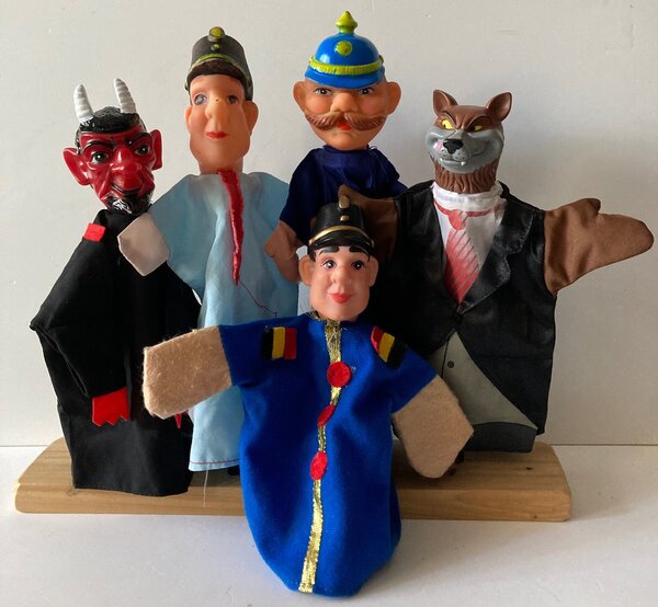 Marionnettes à main avec plusieurs personnages de contes. Les têtes sont en plastique dur et le corps est en tissu. Elles sont en très bon état (voir photos) malgré la production très vintage.