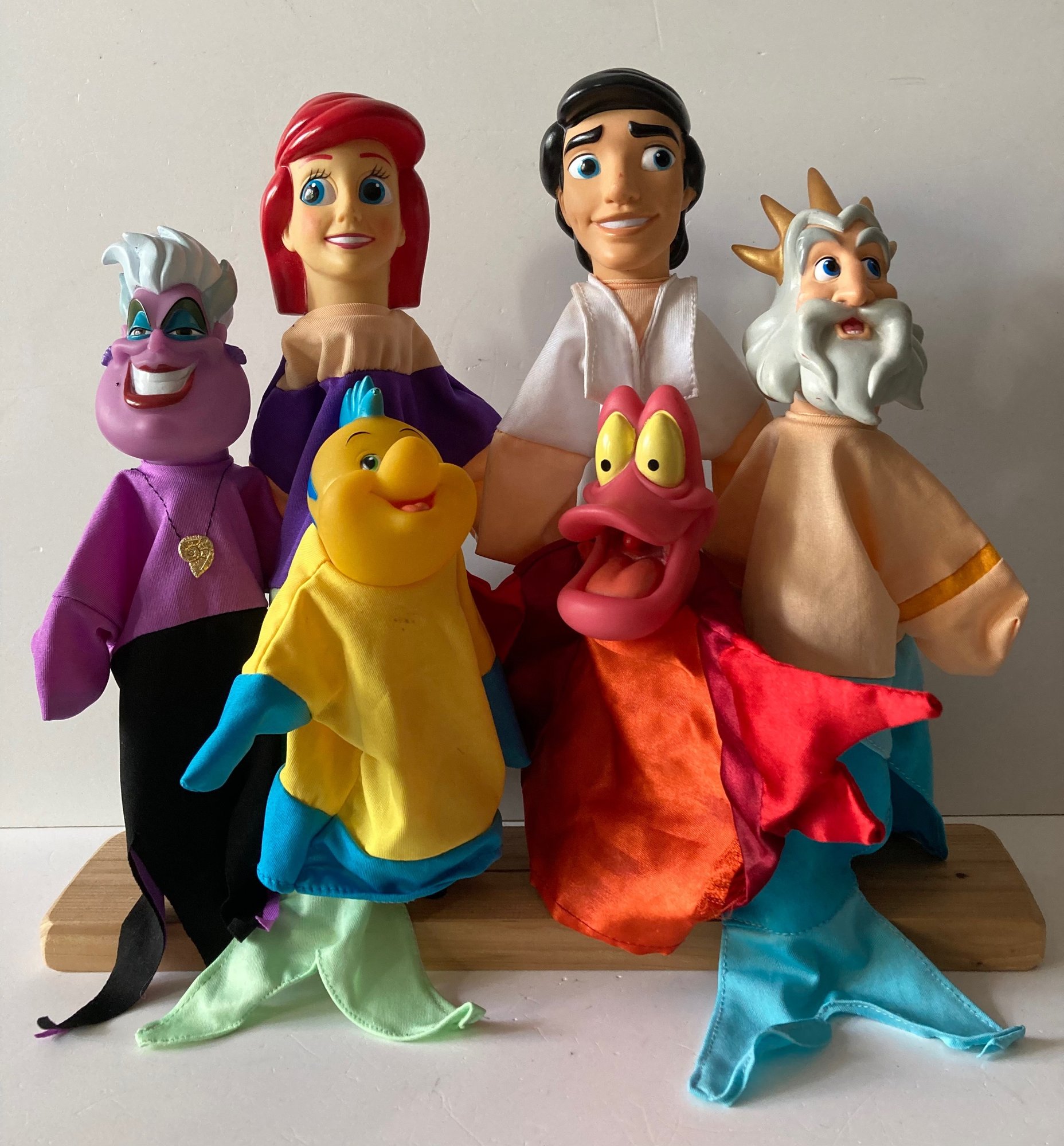 Marionnettes à main issues du film La petite sirène de Disney avec les personnages : Ariel - Ursula - Triton (le père d'Ariel) - Eric - Polochon - Sébastien. Les têtes sont en plastique dur et le corps est en tissu. Elles sont en très bon état (voir photos) malgré la production très vintage.