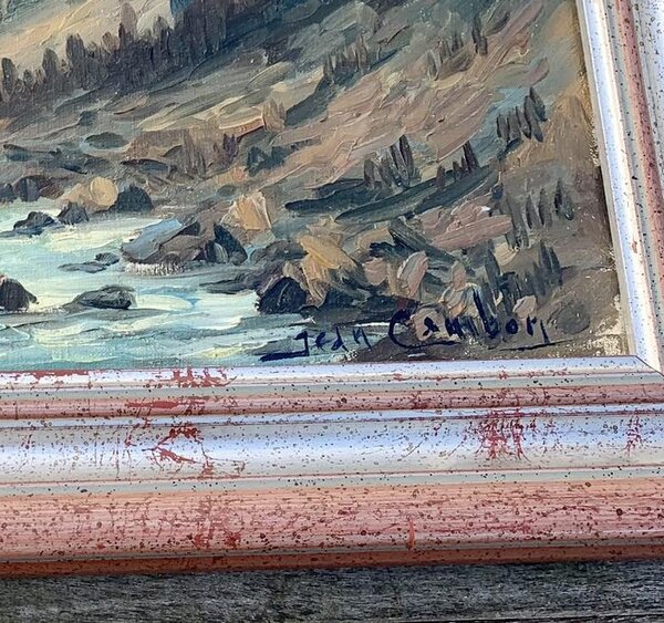 Peinture huile sur toile intitulée "Vue des Pyrénées" de l'artiste Cambon Jean datée de 1951. La signature de l'artiste est en bas à droite et la peinture est dans un cadre avec une patine.