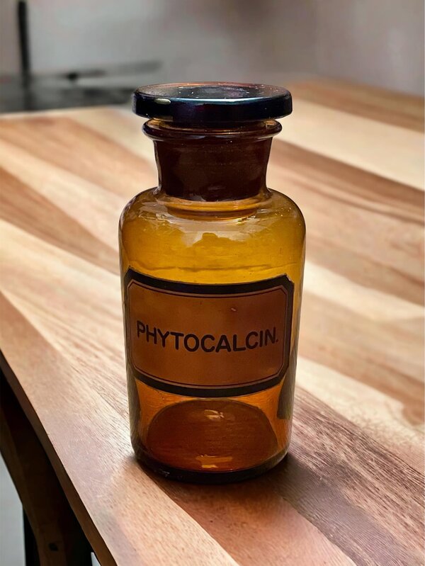 Pot d'apothicaire en verre ambré pouvant contenir plus de 0,50L avec un bouchon plat et une étiquette : Phytocalcin.
