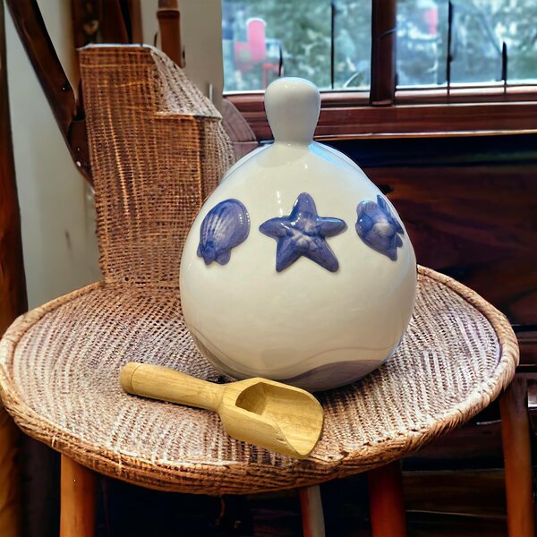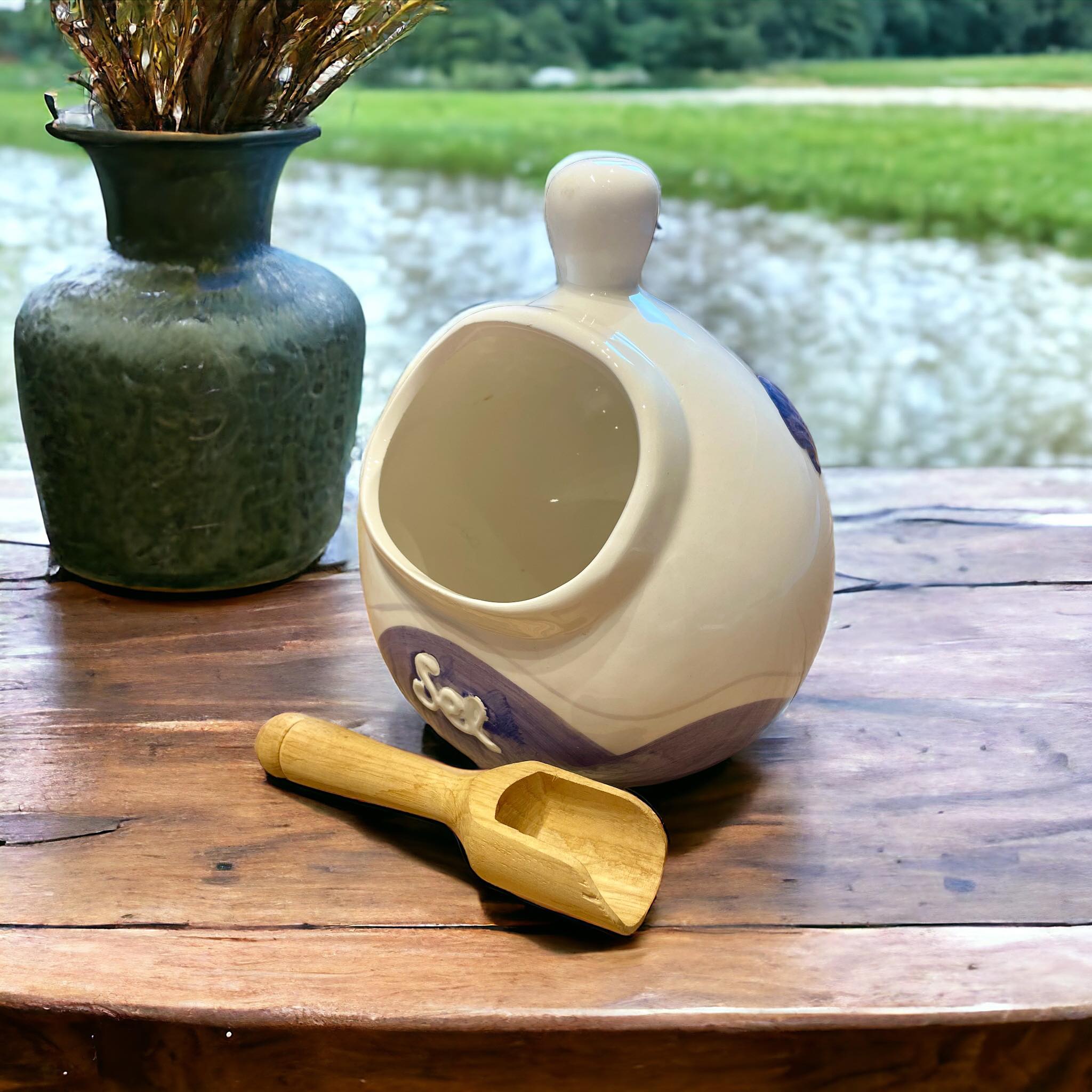 Pot pour le sel en céramique avec cuillère en bois de style méditerranéen. Le pot mesure 18 cm de haut, 13 cm de large et 11 cm de profondeur