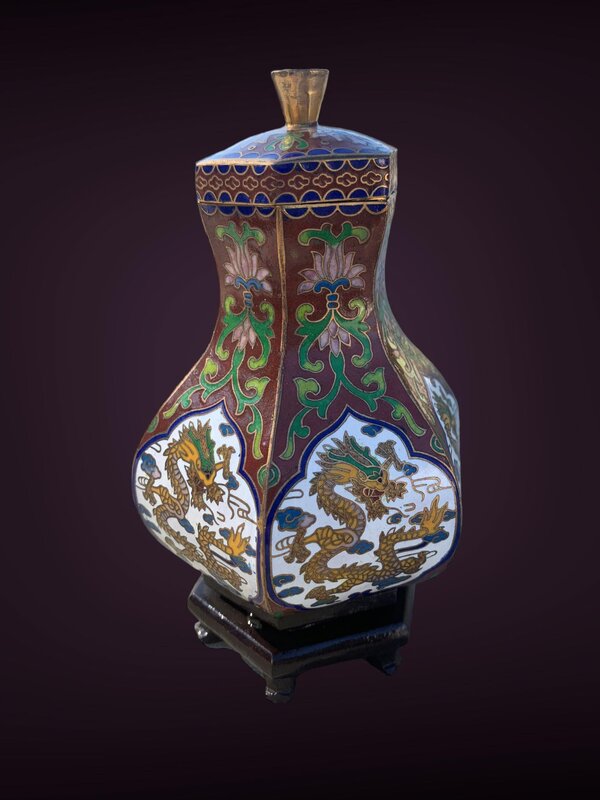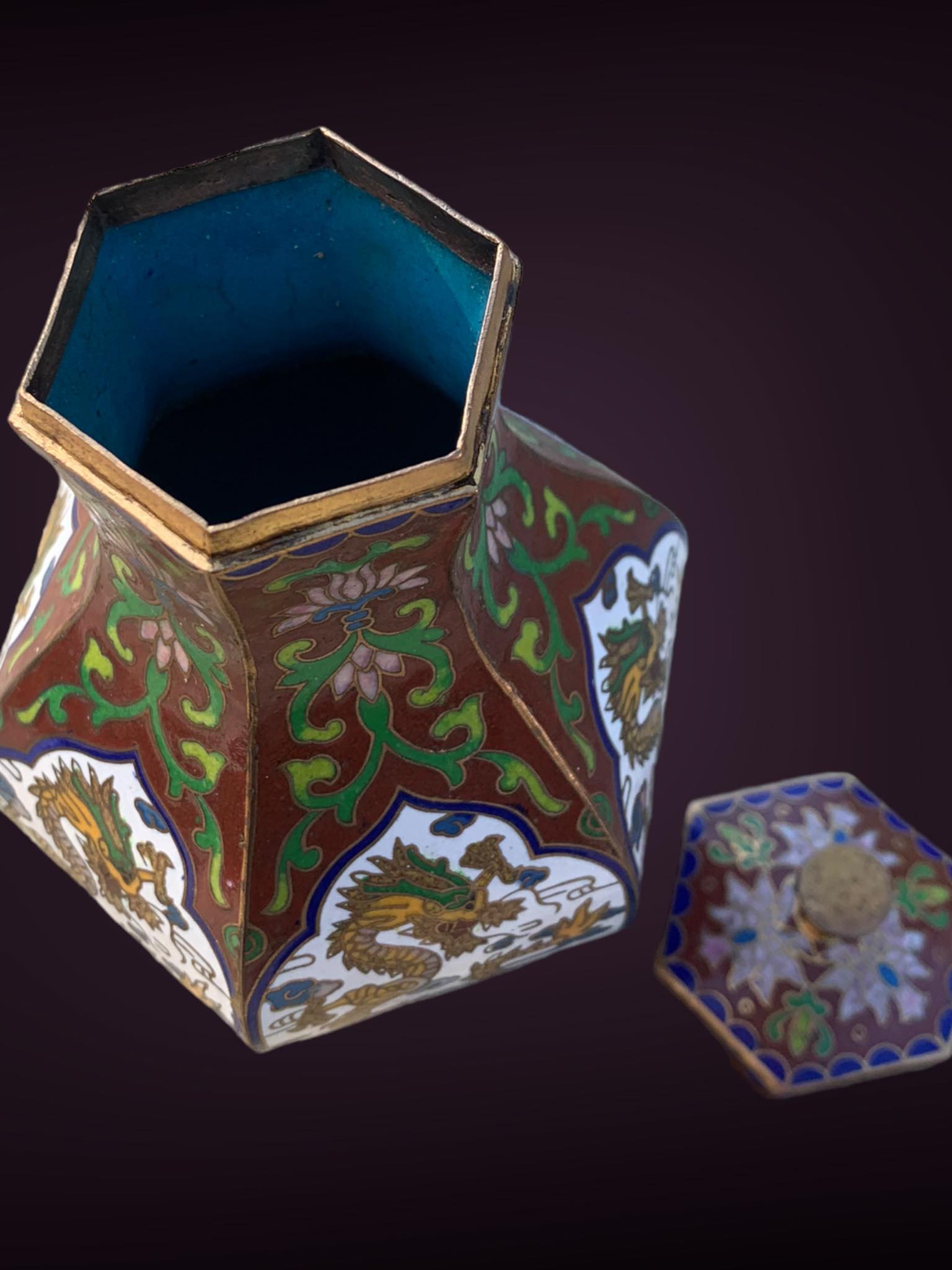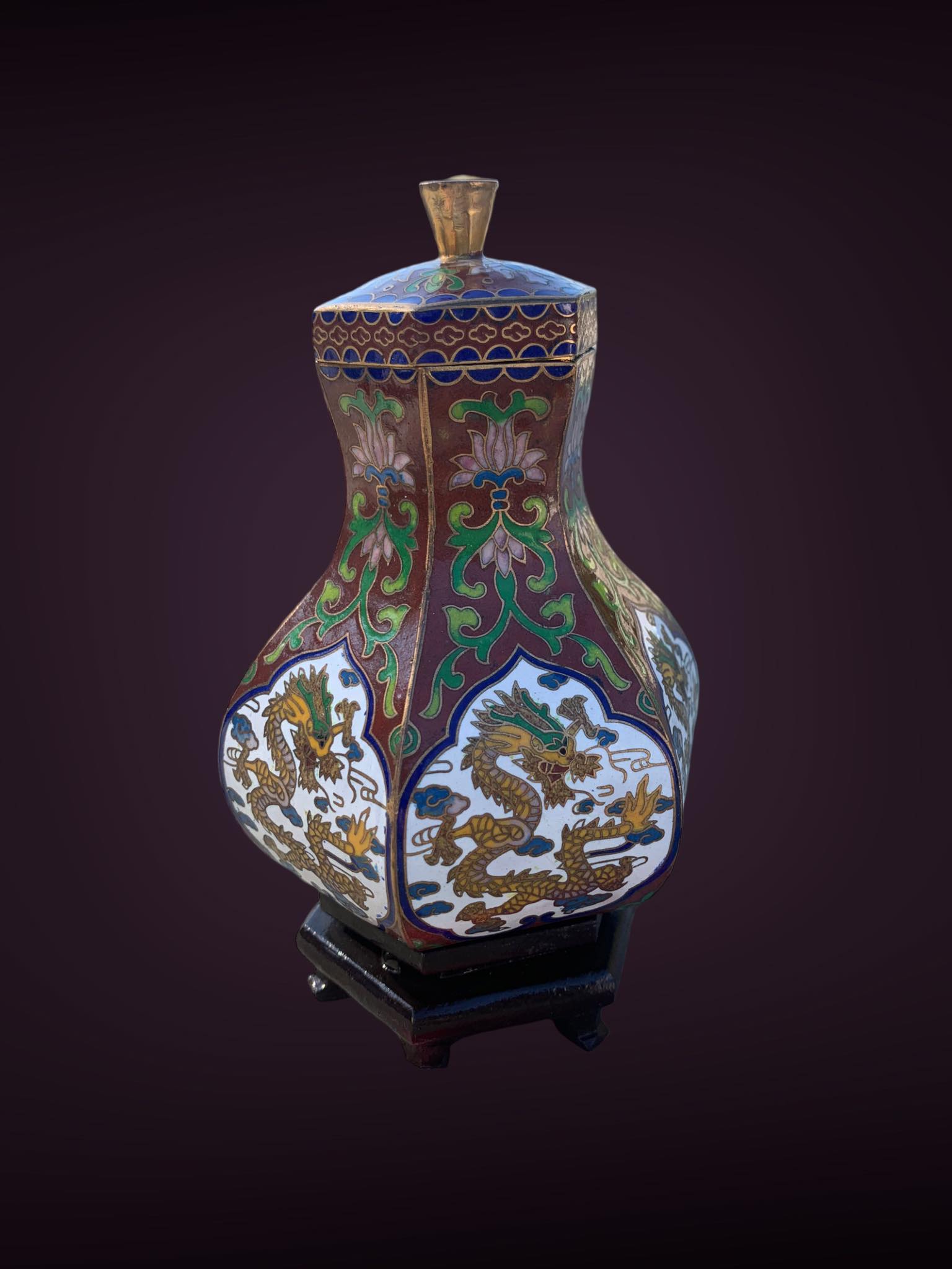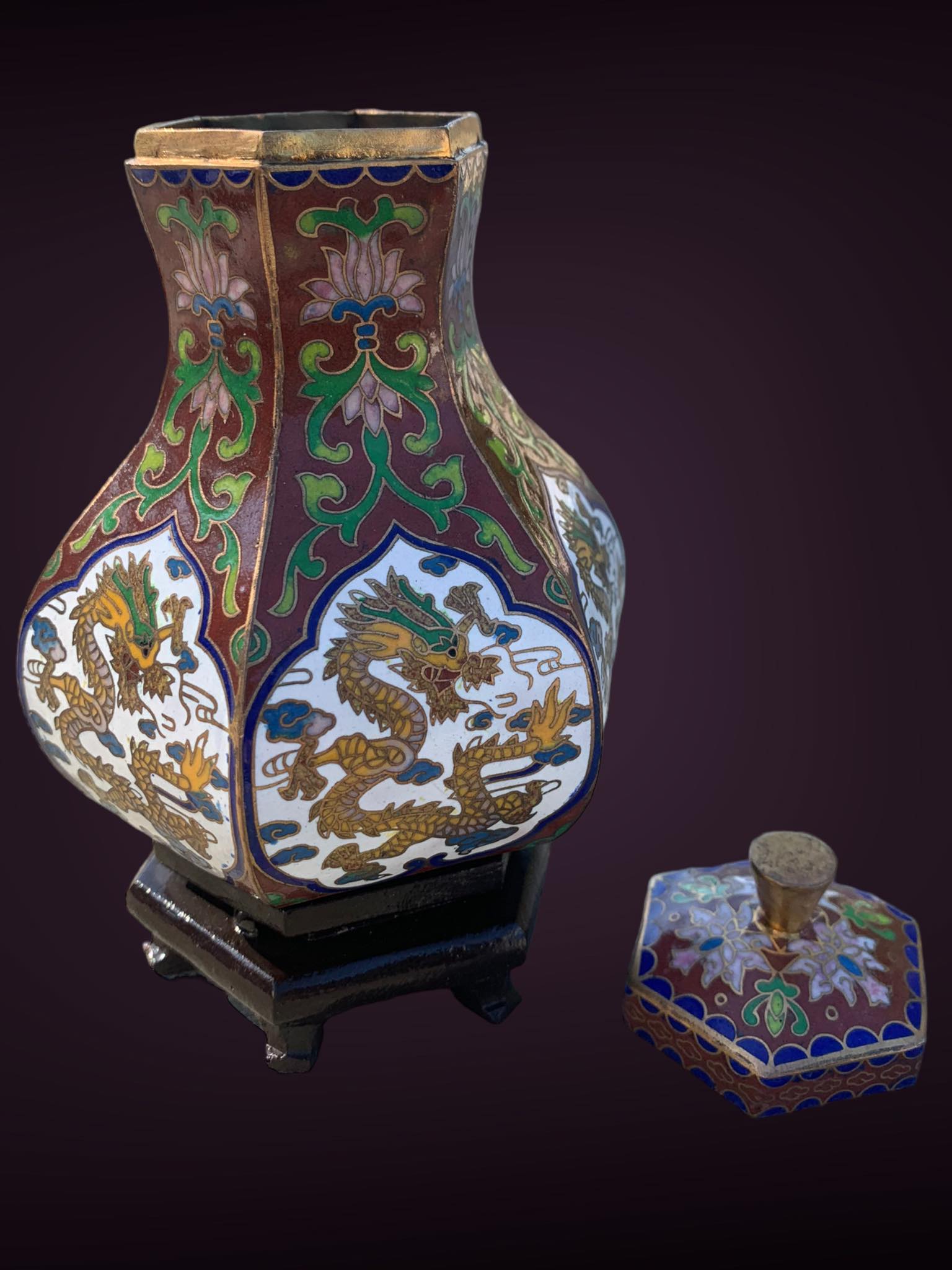 Potiche en émaux cloisonnés à décor de dragon et fleur de lotus sur son socle. La potiche est de forme hexagonale, se referme correctement et chaque face est similaire.