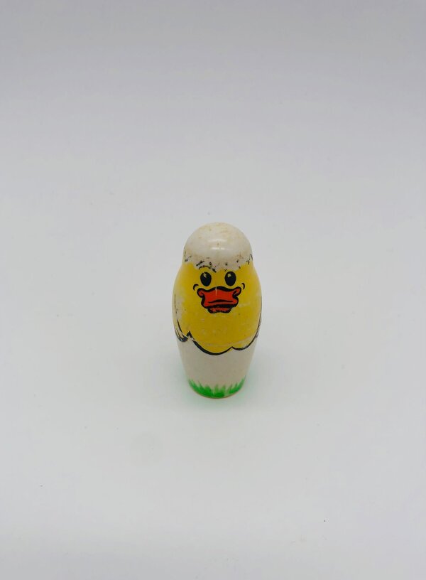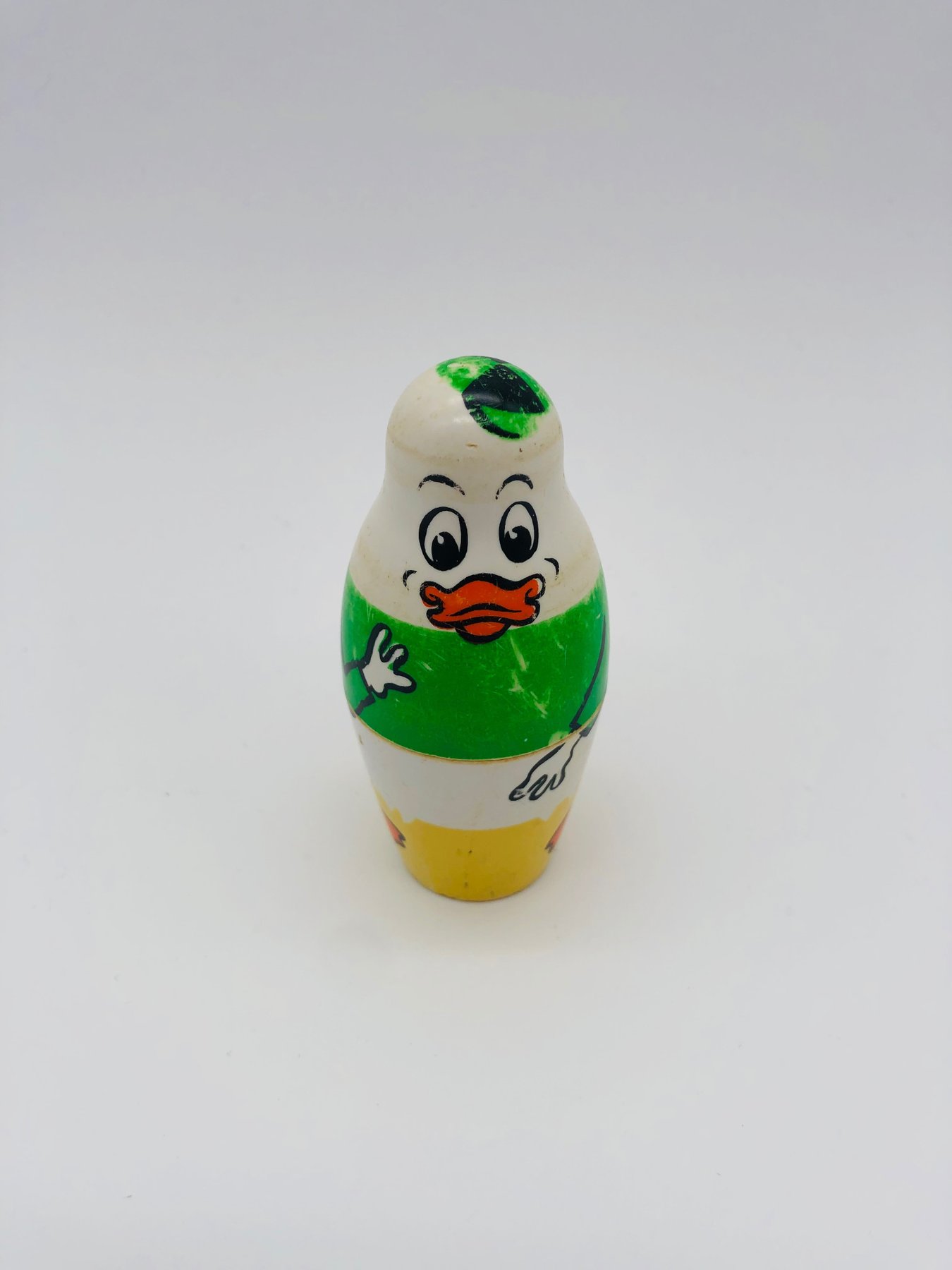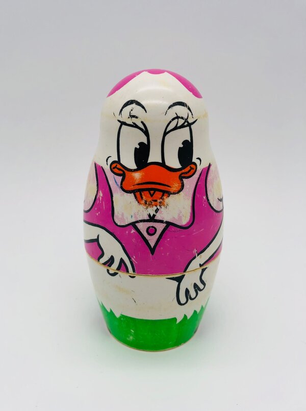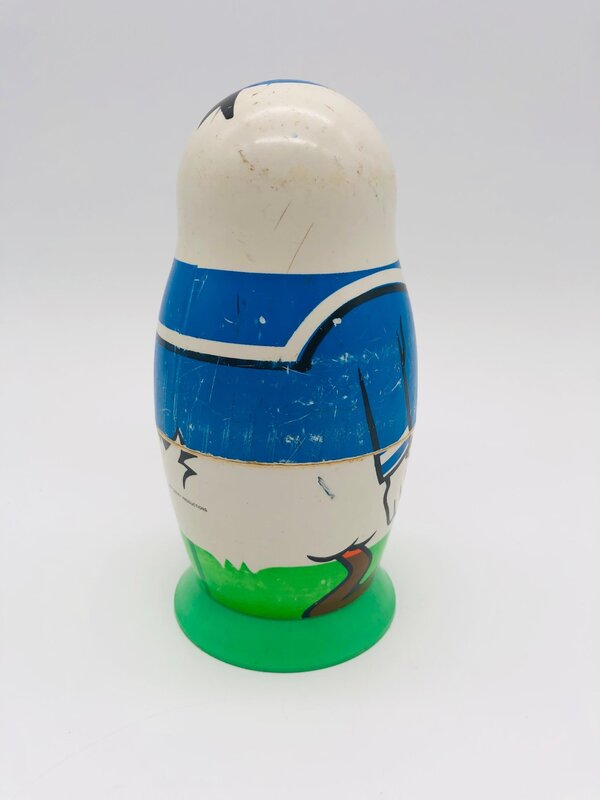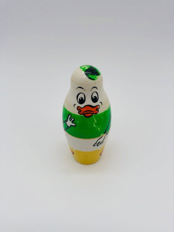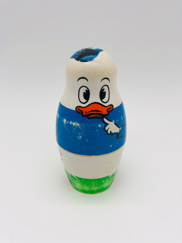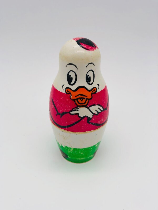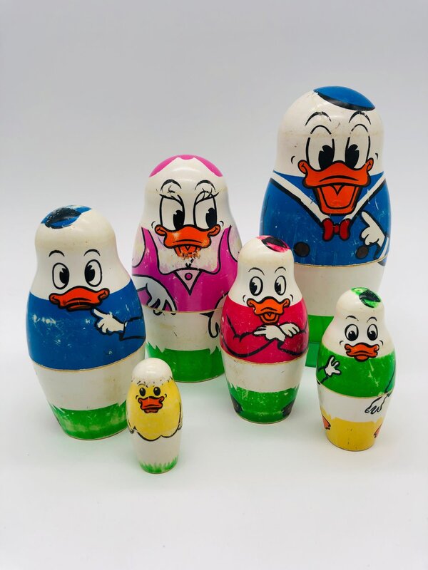 Poupées Matriochka de la famille Duck avec Donald Duck, Daisy Duck, les 3 neveux : Riri, Fifi et Loulou ainsi qu'un petit poussin. Les poupées sont faites en plastique dur, s'emboîtent parfaitement et ont des signes d'usure car il s'agit d'un jouet des années 1960.