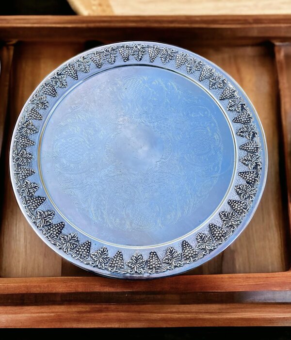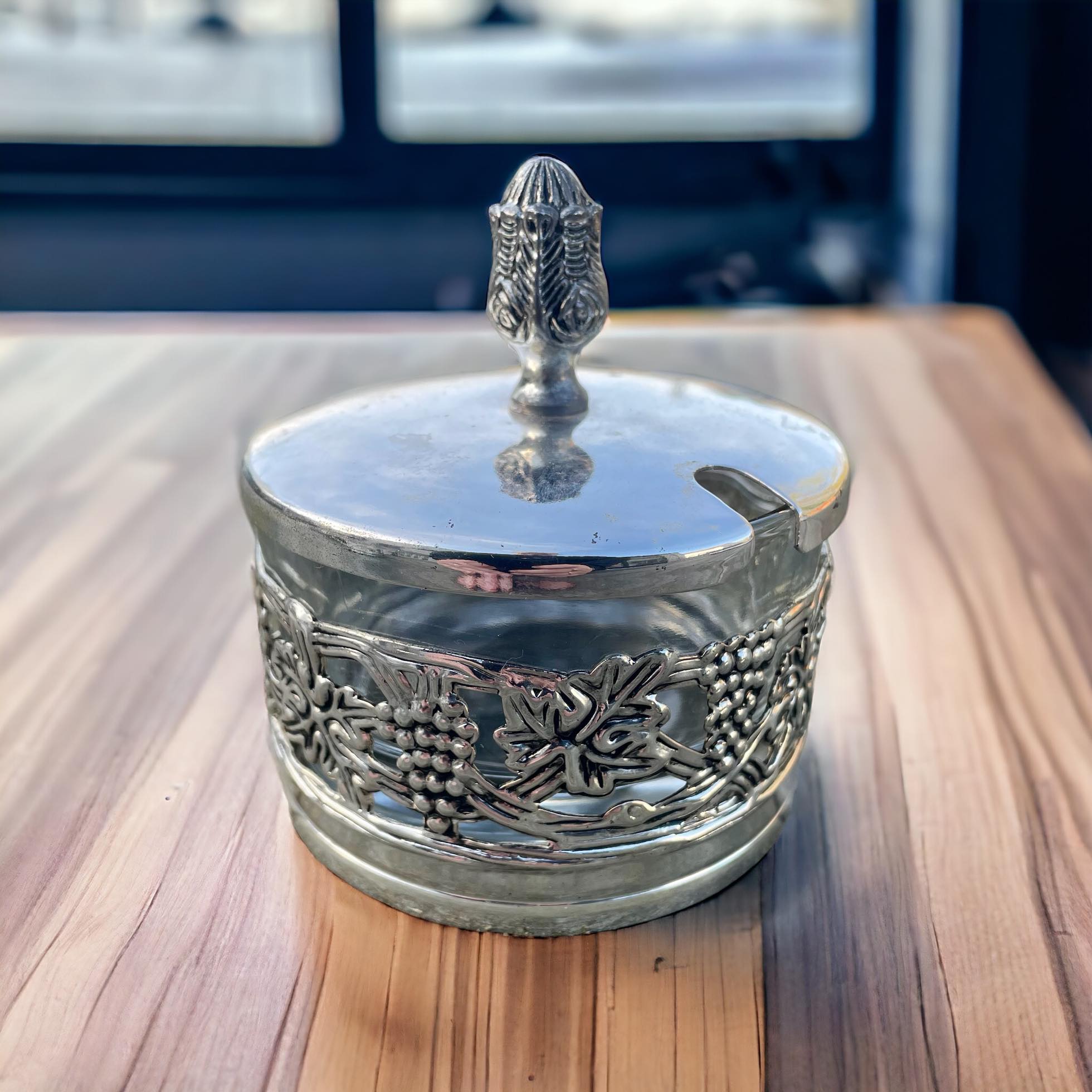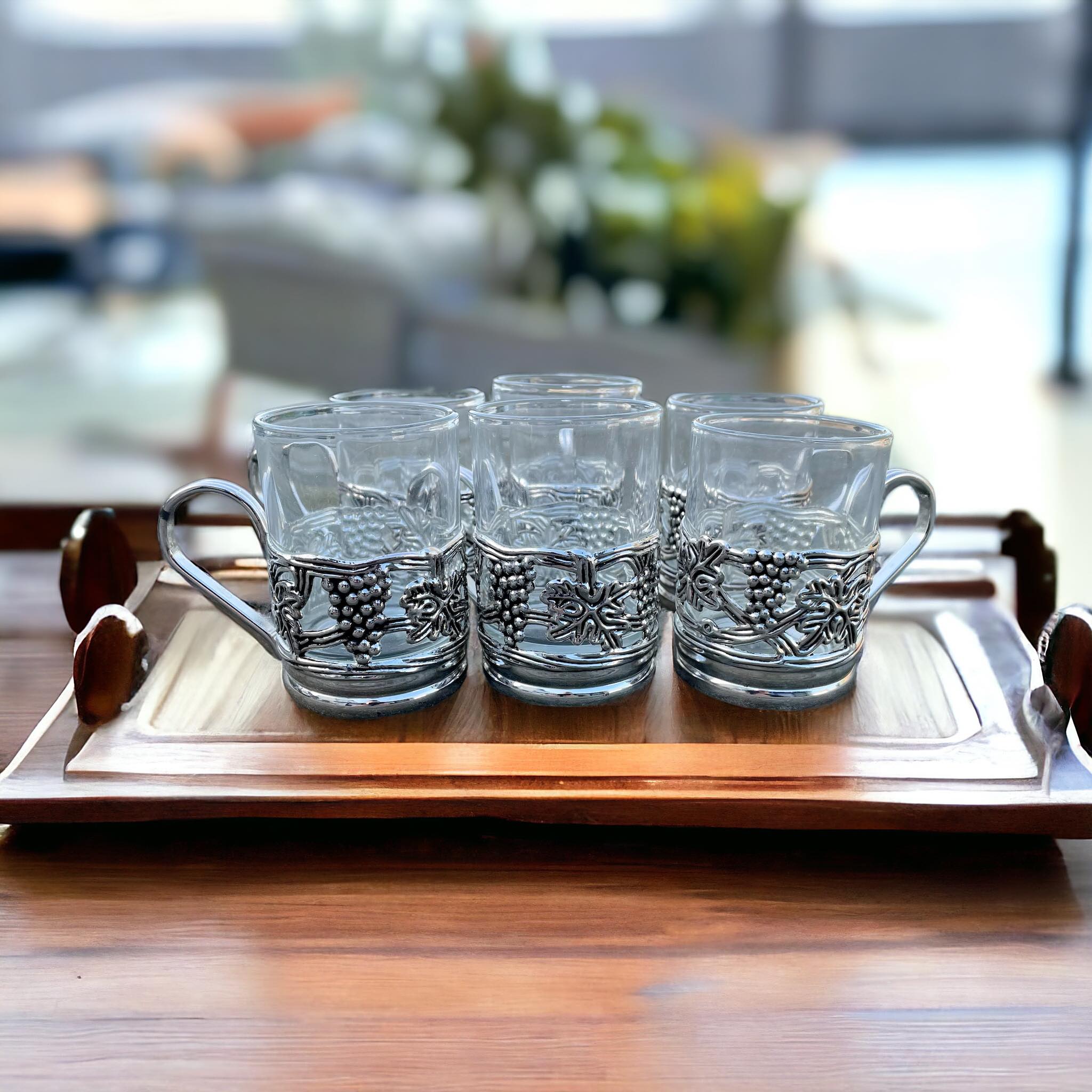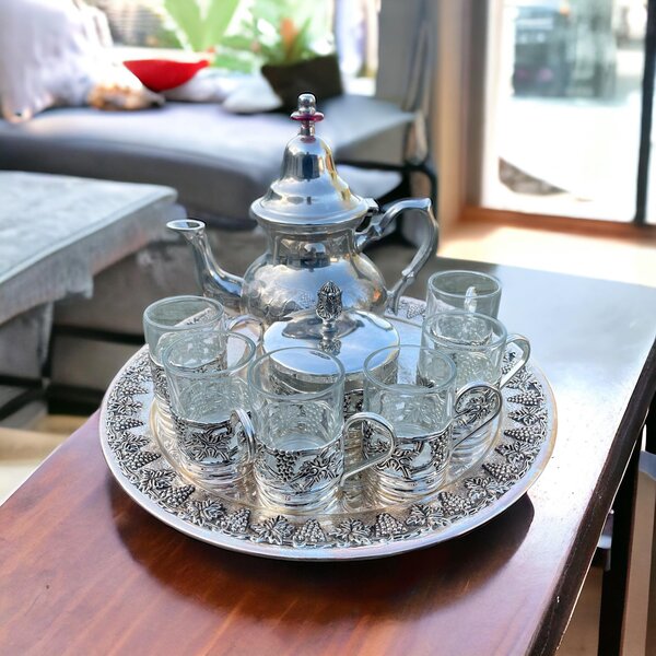 Comprend : une théière, un pot à sucre, un plateau et 6 verres tous décorés de grappes de raisin